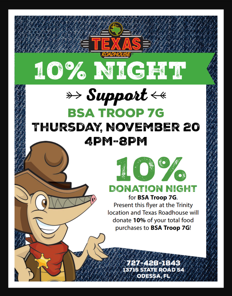 Join us Thursday November 20 at Texas Roadhouse Starkey Ranch. Show this flier and 10% of your purchase supports the troop!